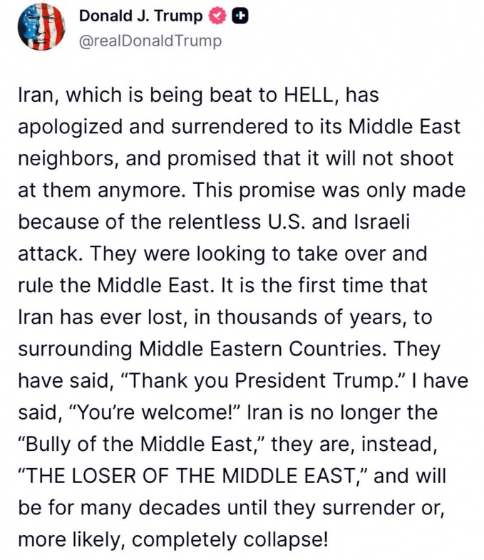 Trampın sözlərinə görə, İran hazırda çox çətin vəziyyətdədir və region ölkələrinə qarşı hücumları dayandıracağına söz verib. O iddia edib ki, bu qərar ABŞ və İsrailin davamlı hücumları nəticəsində qəbul olunub.