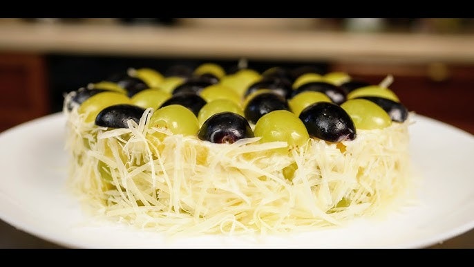 Ananası süzün və doğrayın. Pendir iri gözlə rəndələnir, üzüm yarıya bölünür, sarımsaq əzilir. Hər şeyi bir qabda qarışdırın, mayonez əlavə edin və ehtiyatla qarışdırın. Salatı 15–20 dəqiqə soyuducuda saxlayın ki, ləzzətlər bir-birinə qarışsın.
