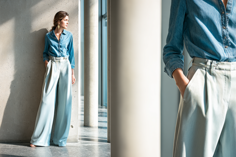 Morozovanın sözlərinə görə, geniş şalvar baza elementidir və psixoloji rollara asanlıqla uyğunlaşır. Cins köynəklə gündəlik, ipək top ilə isə axşam dəvəti üçün uyğun obraz yaratmaq mümkündür.